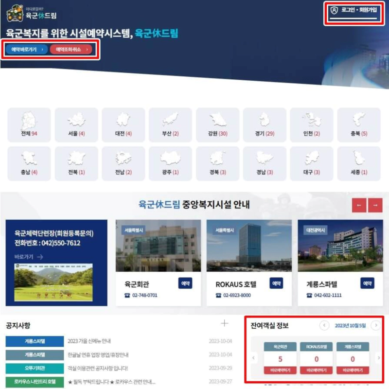 로카우스 호텔의 군할인 혜택을 위해서는 일반예약이 아닌 육군복지포털 '육군휴드림' 사이트를 이용하여 예약을 해야 합니다. 이미 회원이시라면 아래 링크를 통해 이동하여 로그인 후 일자별 잔여객실 확인 후 예약을 진행하시면 됩니다. 만약 아직 비회원이시라면 마지막 문단의 '육군 휴드림 이용방법'을 먼저 확인해주시기 바랍니다.