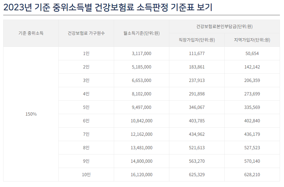 ☞ 기준 중위소득은 신청인이 속한 가구의 2023년도 4월분 건강보험료 고지금액(본인부담금)으로 판단